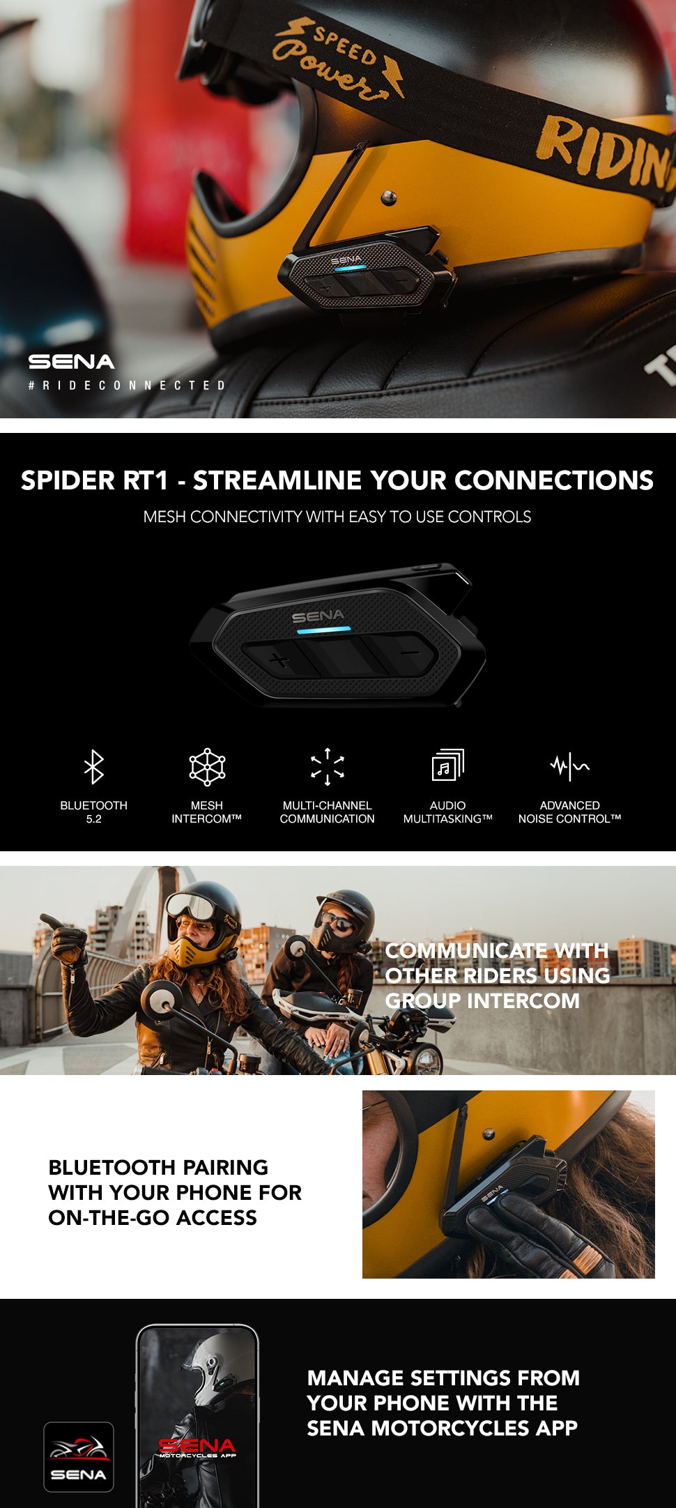 Introducing the SPIDER RT1, an affordable, low-profile headset with a sleek three-button control by Sena. The SPIDER RT1 is one of Sena’s first motorcycle communication headsets operating exclusively on the groundbreaking Mesh intercom platform, at an impressive price. Sena’s premium Mesh technology, as first seen in the flagship 50S and 50R headsets, streamlines rider-to-rider communication for large and small groups and now delivers that same robust reliability for all SPIDER RT1 users.